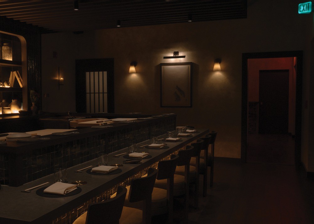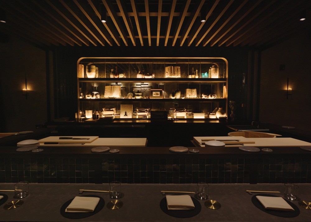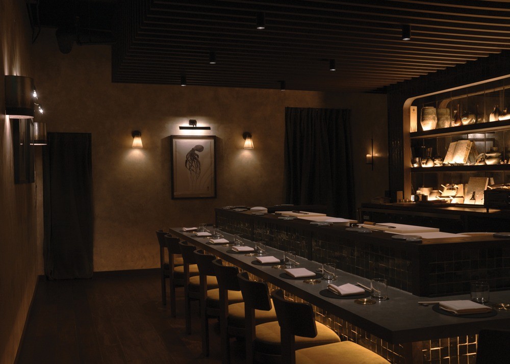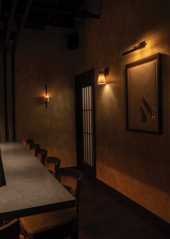 LED lights around the omakase bar create a warm glow, and the bar’s u-shaped design encourages guest interaction with each other and the chefs.