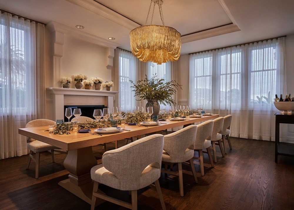 Natural wood tones and neutral hues establish a calm, contemporary atmosphere, complemented by modern furnishings including globe pendants, plush banquette seating and soft accent pillows. The result is a serene expression of coastal interiors that balance sophistication and comfort.