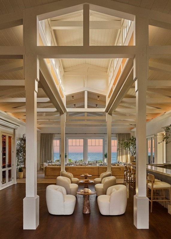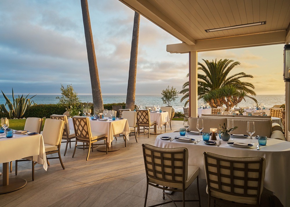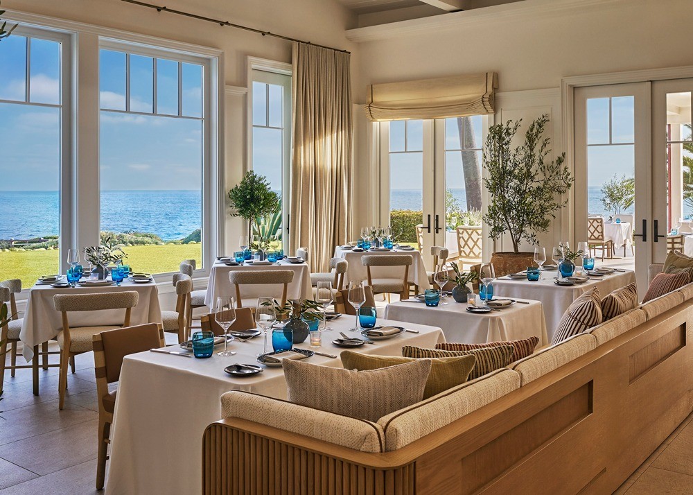 Upon entering the oceanfront restaurant, guests are greeted with crisp white beamed ceilings and floor-to-ceiling windows that frame panoramic views of the Pacific.