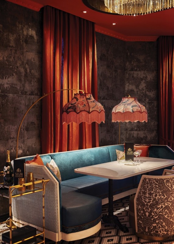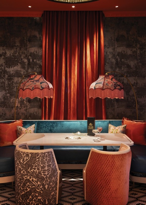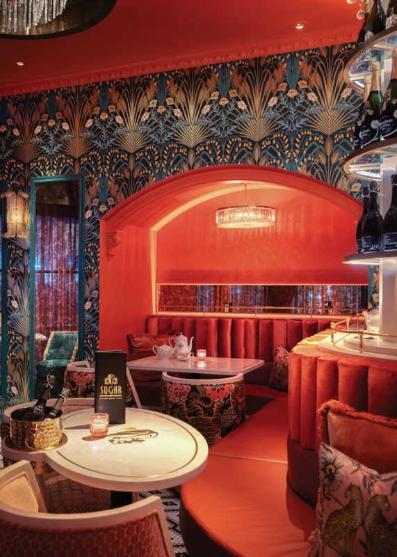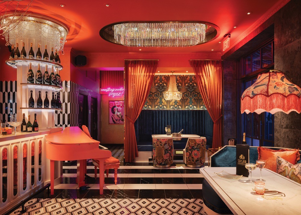 Texture plays a key role in the sensory experience at Sugar Champagne Bar. With interiors by Blok Design Group, the 1,000-square-foot elevated champagne bar features velvet banquettes, marble surfaces, lacquered finishes and patterned wall coverings that create tactile richness and depth. Rich, moody tones like deep corals, soft pinks and bold teals are paired with gold accents and theatrical lighting to create visual drama.