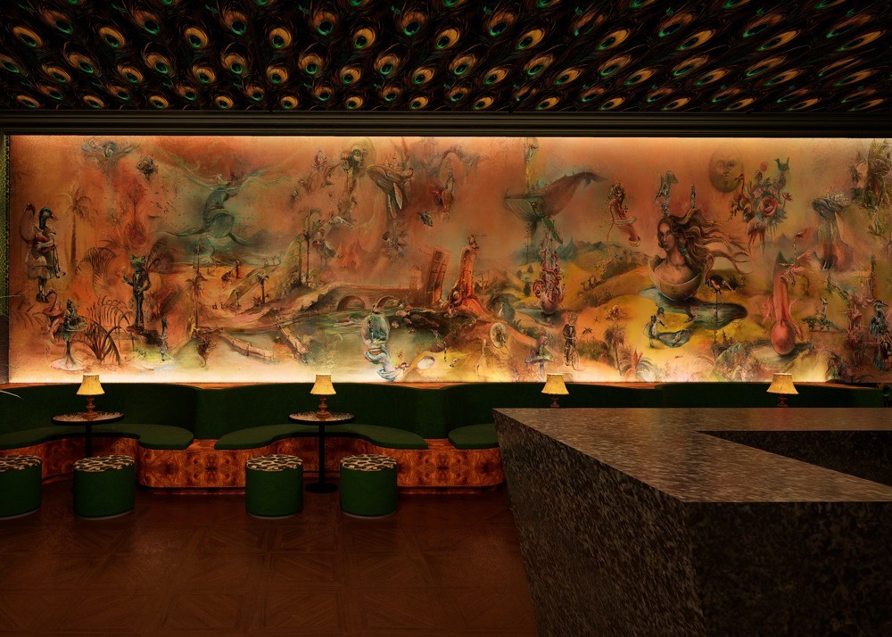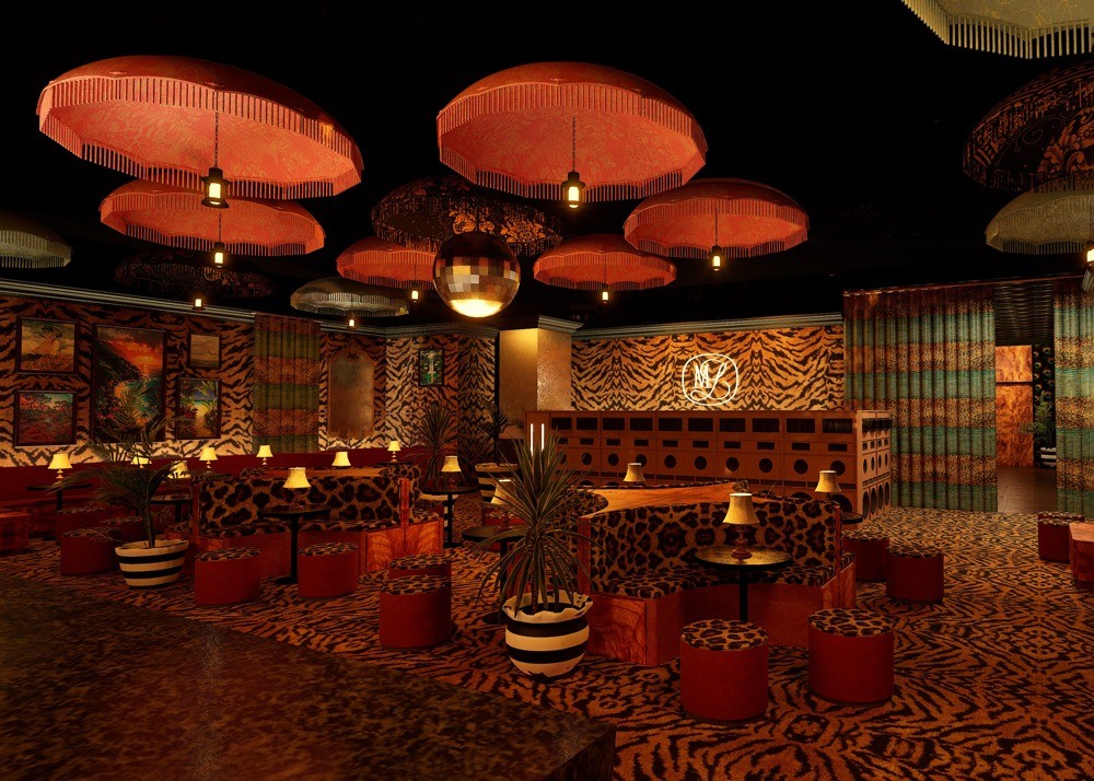 Designer Jason Volenec led the interior reworking of the space. The design incorporates patterned wall coverings, animal prints and layered textures, drawing from the brand’s established visual language while referencing Miami Beach nightlife. The redesign emphasizes low lighting, dense materiality and flexible zones that accommodate dining, cocktails and dancing.