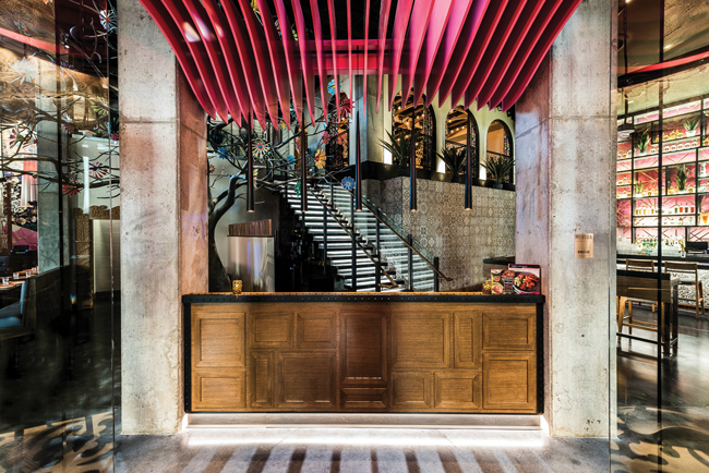 Upstairs, the 2,700-square-foot “parlor” was designed to be more opulent and luxurious with shades of purple and charcoal, tufted leather banquettes, purple velvet barstools and a granite-topped bar seating 10. Private dining space can seat about 35 to 40 people.