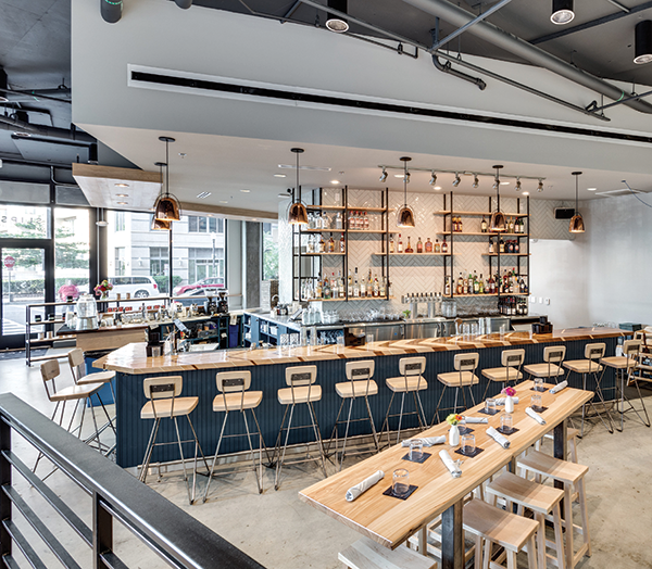 The design of the seating layout appeals to both the daytime and nighttime crowd. “We have some seating arrangements that are very flexible, so you can sit by yourself at lunchtime — most people have lunch in parties of one or two. And in the evening, people tend to go in larger groups,” Musco says.