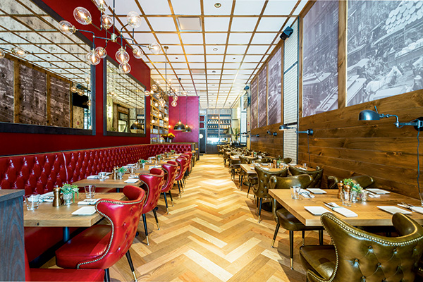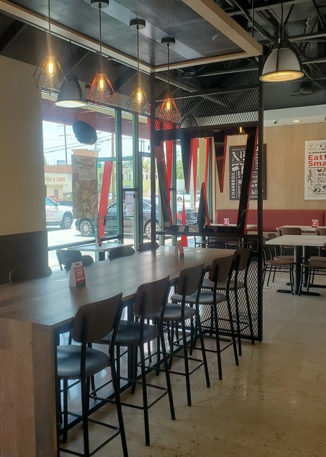 The new store design features exposed woods and iron accents, modern furniture, and lighting, as well as signature flame-grill decor throughout.