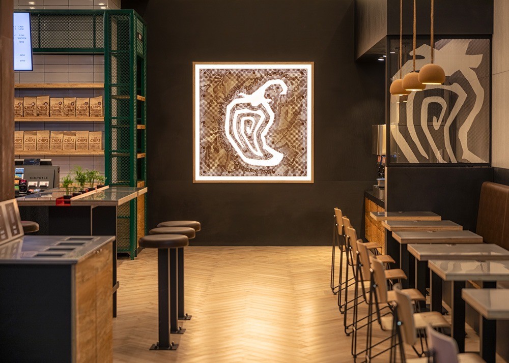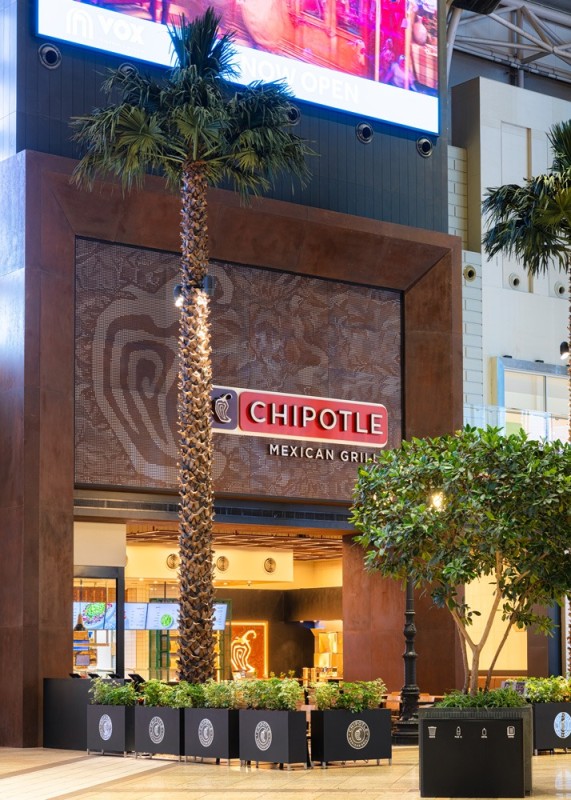 Over the past several years, Chipotle's development team has been building out concepts that deploy new materials, textures, and artwork. The new location in Kuwait is the first Chipotle restaurant featuring the company's newest design. Included in this design is the replacement of Chipotle's signature concrete floor with a wood-look tile. Additionally, the large-scale metal ceiling and lighting elements match the steel frame around the iconic Chipotle pepper on the wall.