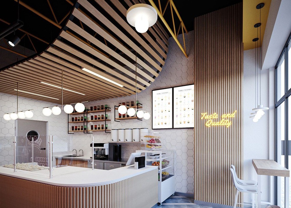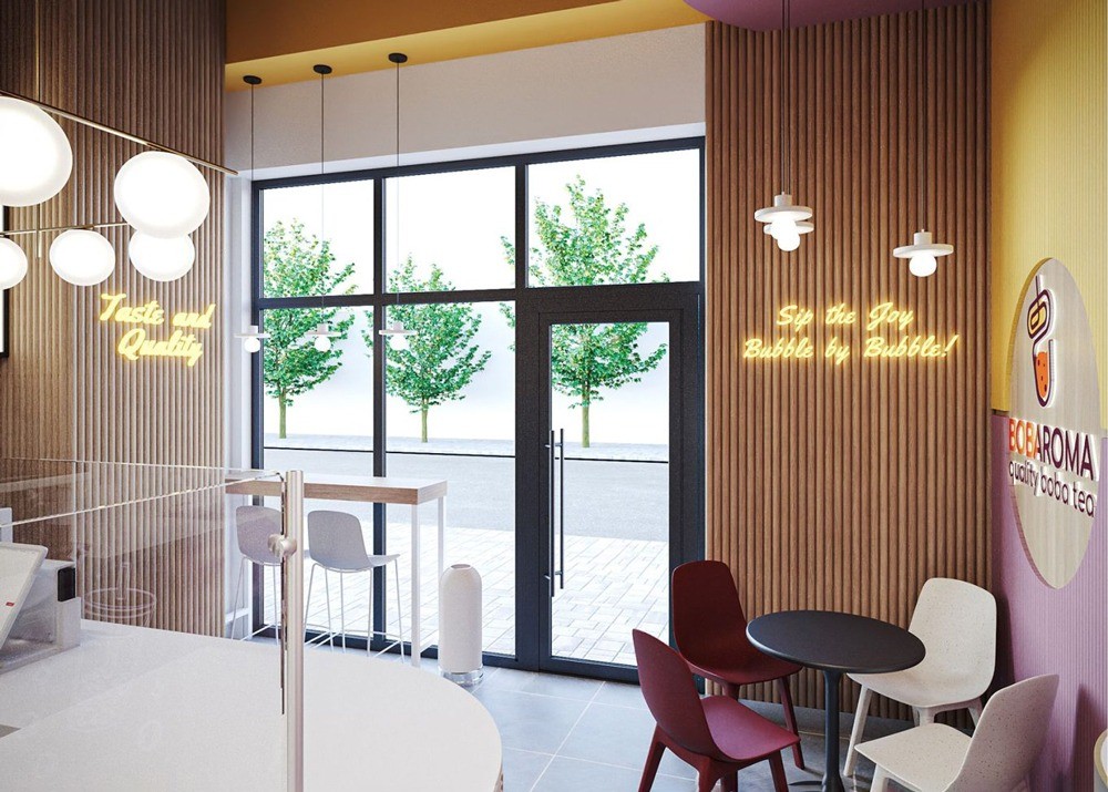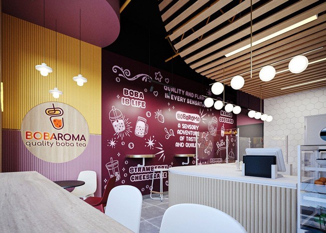 Crafted by Mindful Design Consulting, Bobaroma’s interior reflects the bright colors of its menu offerings. The design boasts a modern aesthetic with a clean backdrop of neutral colors, accentuated by a bold accent wall with playful cartoons of menu items. The integration of wood slats throughout the ceiling, front counter, and walls infuses natural warmth while drawing the eye vertically to visually combat the store’s compact size. The interior layout maximizes space efficiency with curved floating tables and counter-height seating, ensuring comfort without compromising on aesthetic appeal.