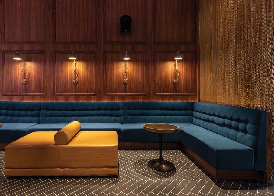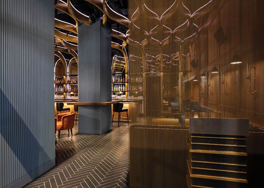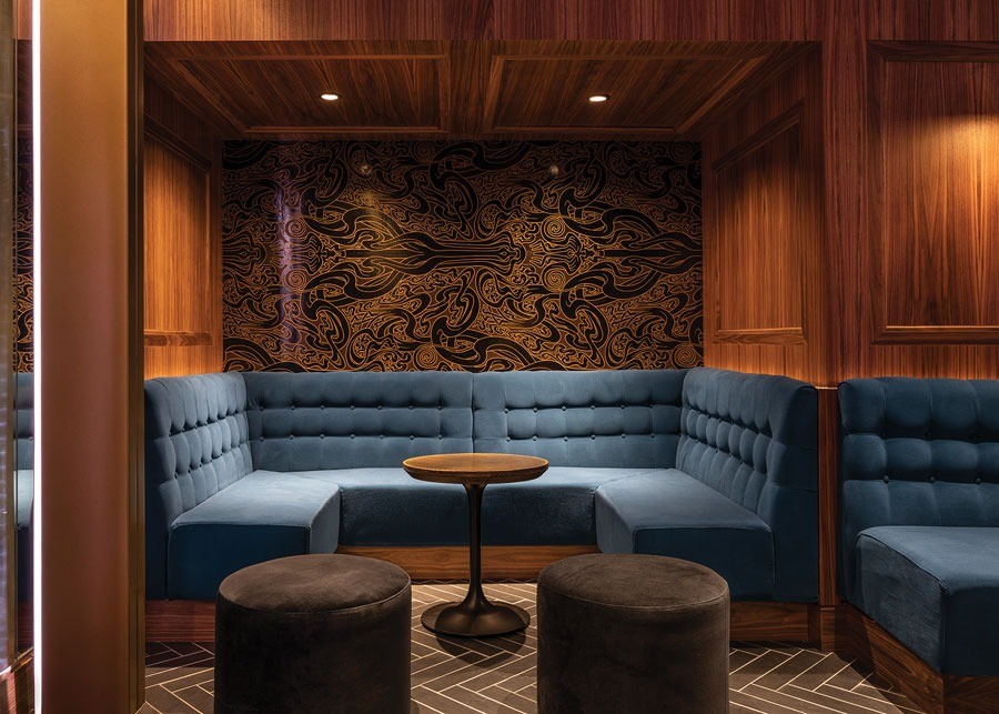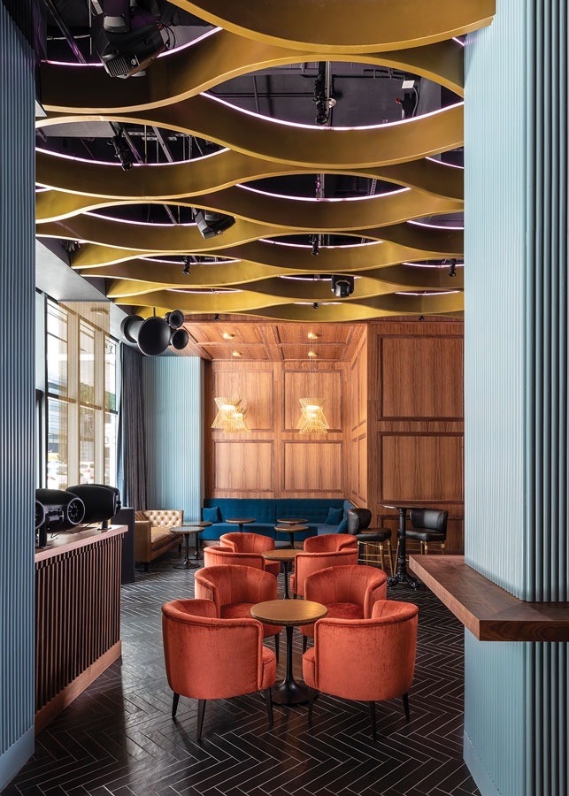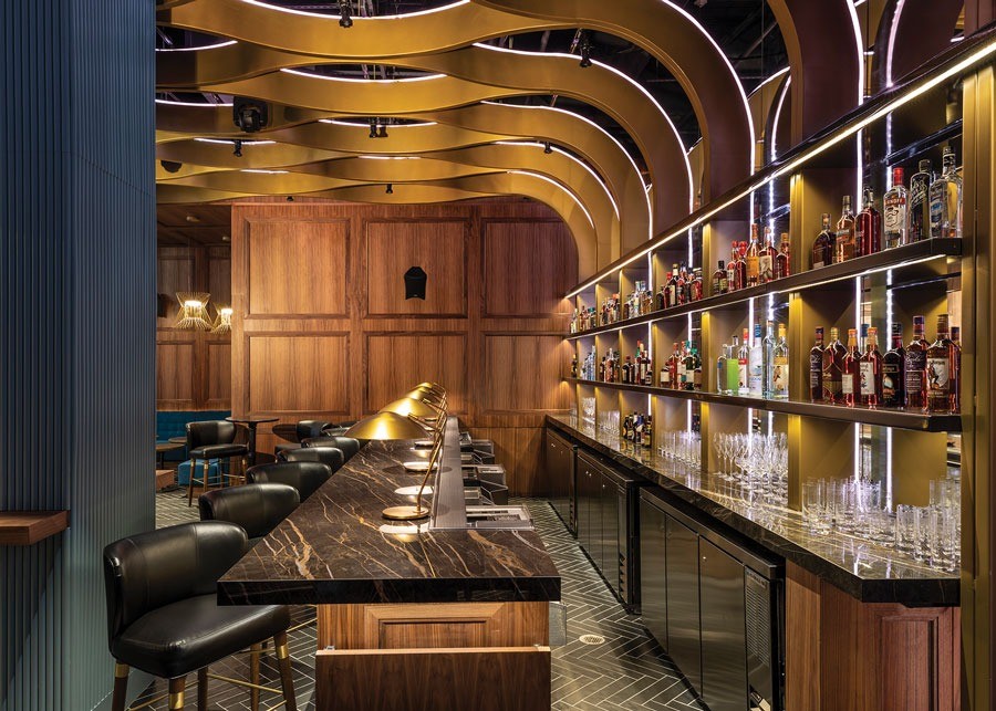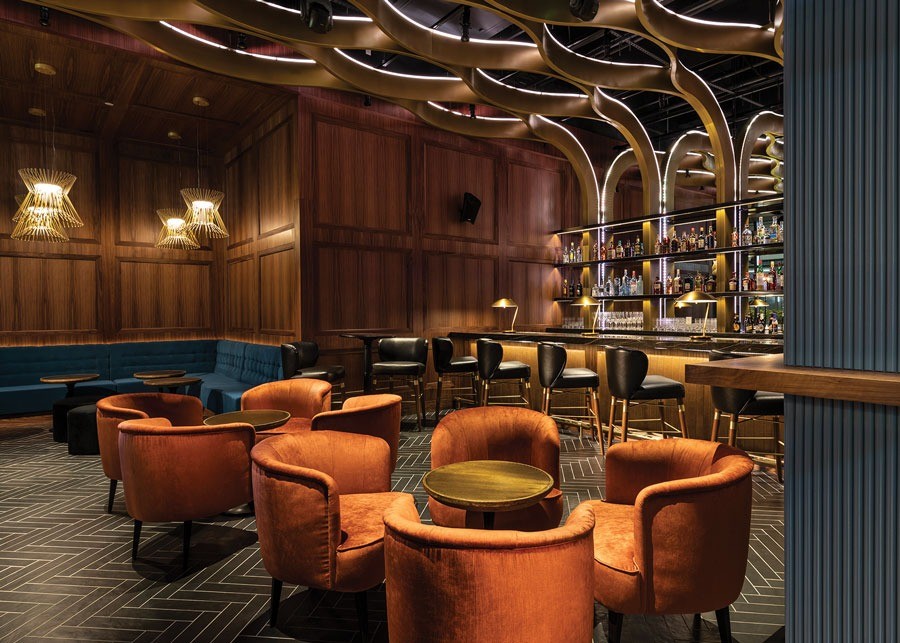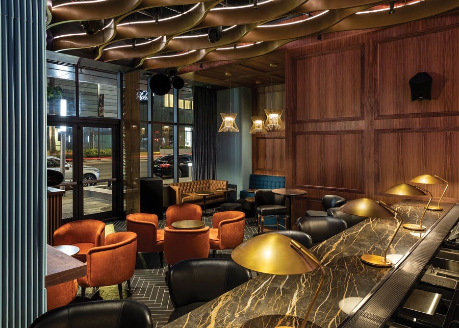 This boutique hotel bar seats 60 and was designed to draw in both hotel guests and locals alike. At just 3,000 square feet, the soaring ceiling threatened to overwhelm the space. The solution — a sculptural ceiling that both hides MEP and lighting while providing a dramatic sculptural element — wowed the judges, as did the overall modern and high-quality design.