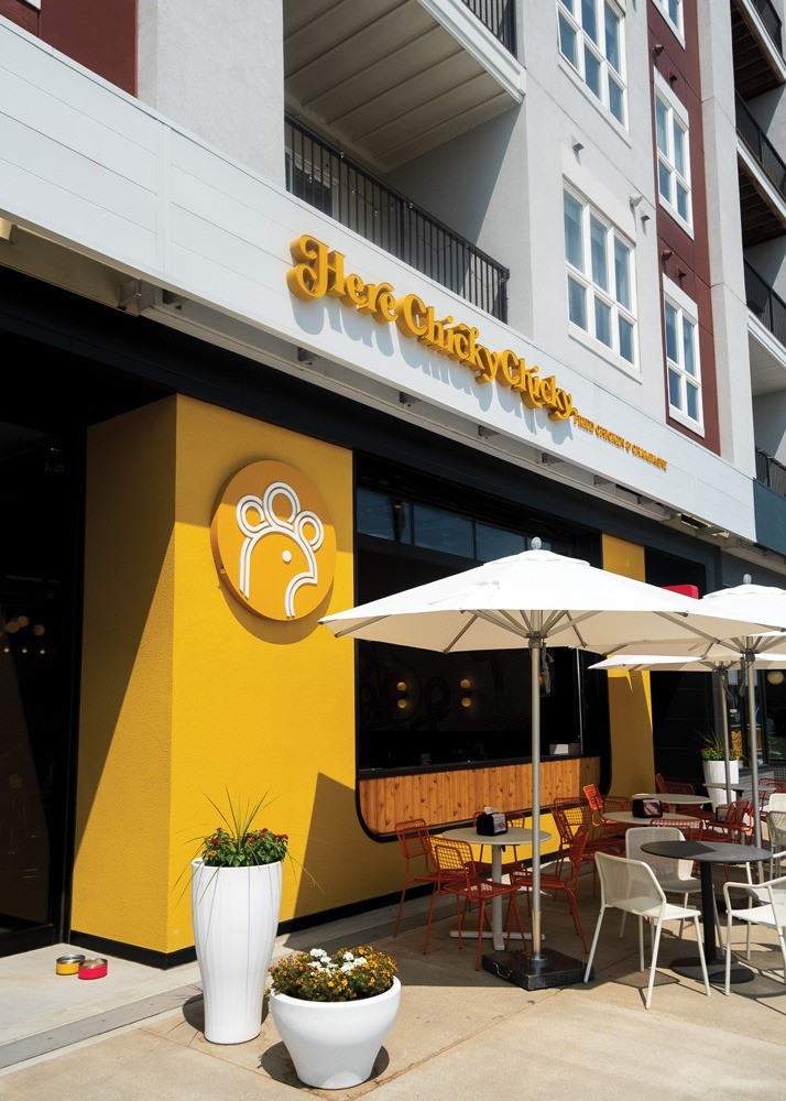 With it’s “glam kitsch” aesthetic, Here Chicky Chicky offers a playful twist on comfort food and design classics. The elevated fast-casual restaurant space seats 77 in slightly more than 3,000 square feet. The vibe is 1970s and that means wood paneling, inviting yellows and oranges, and comfy but chic furnishings.