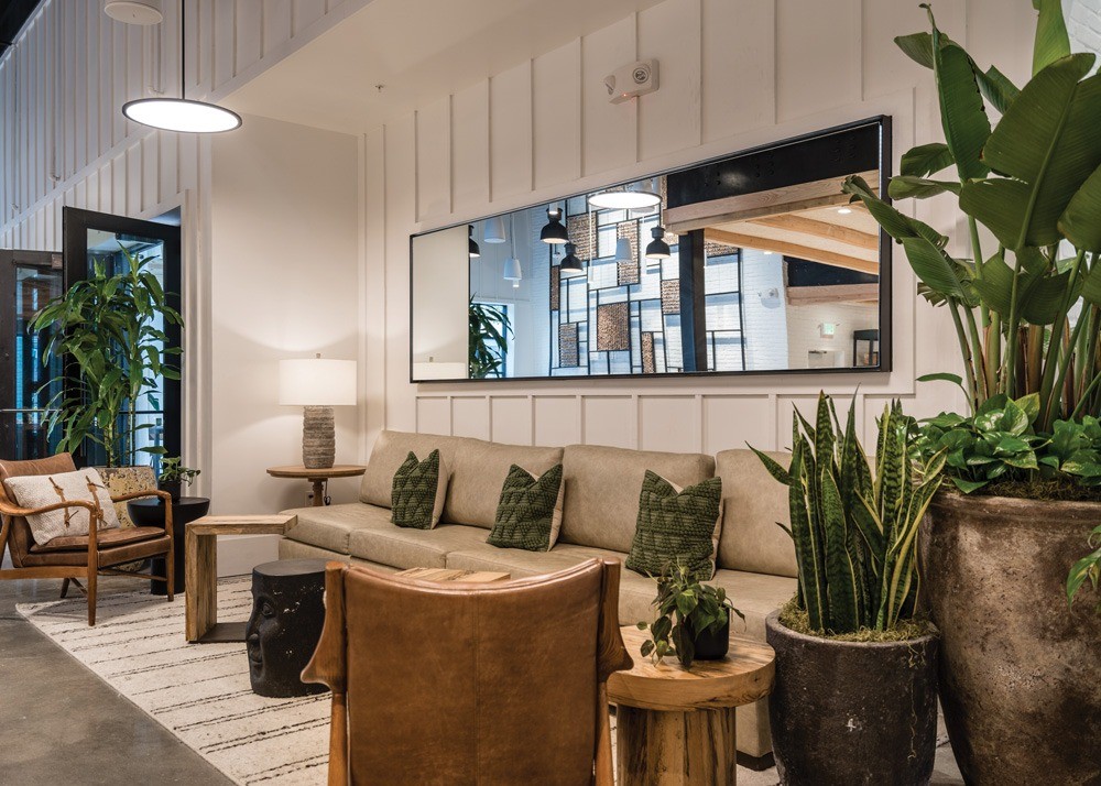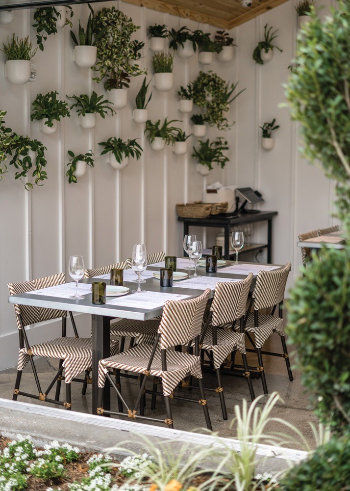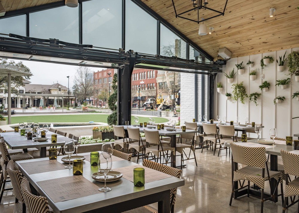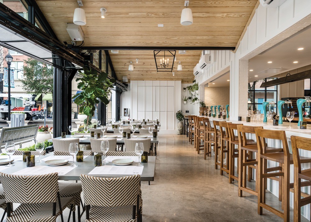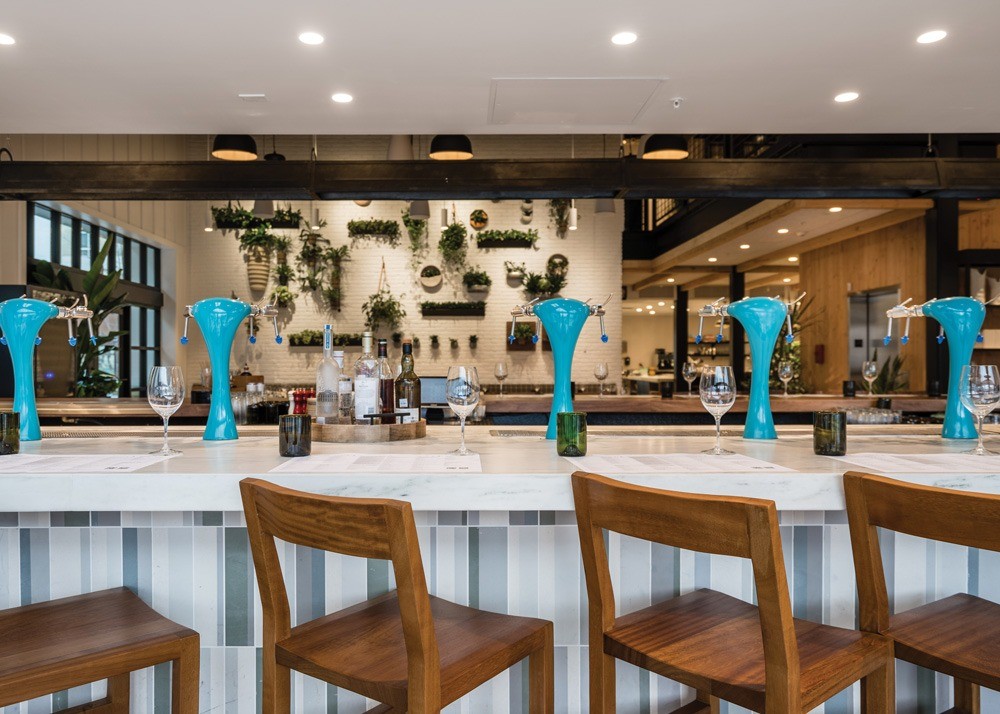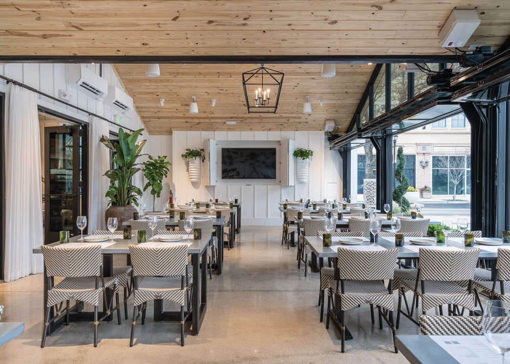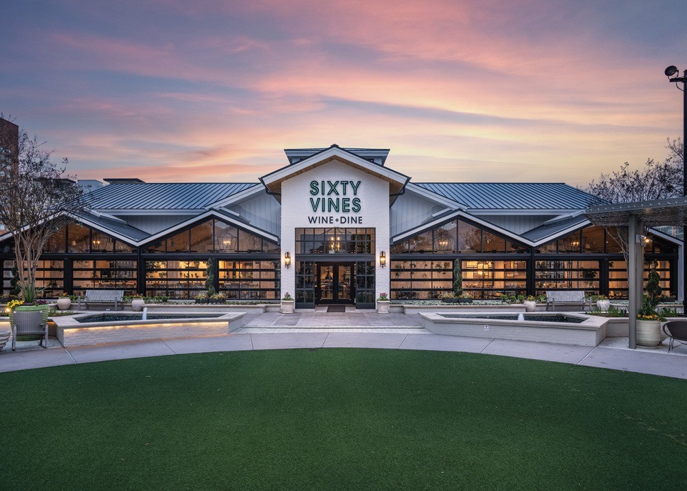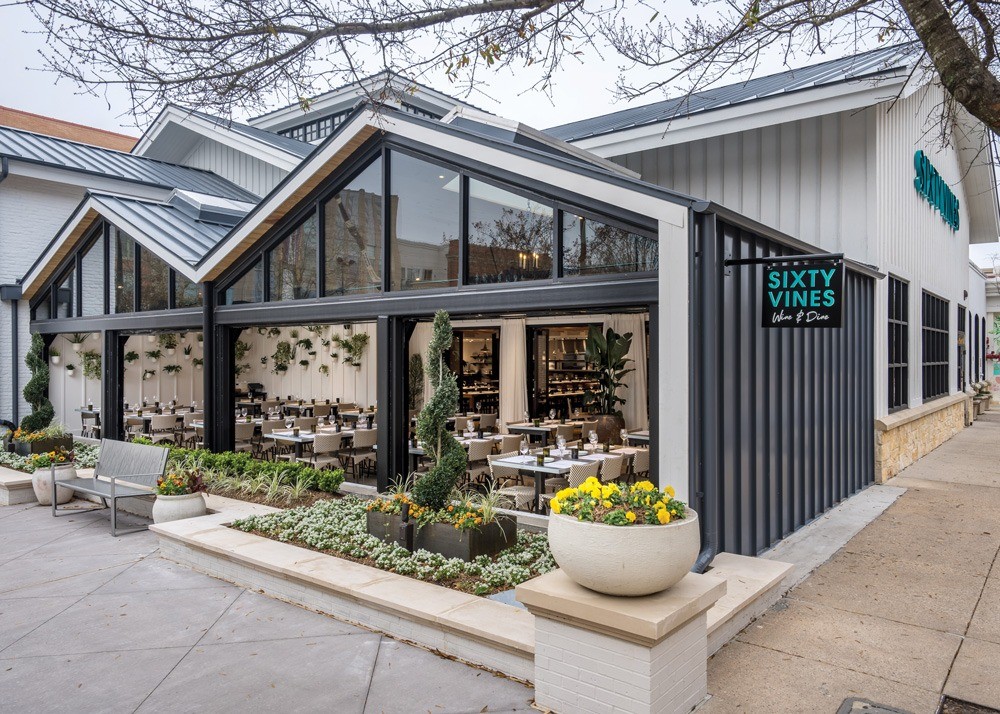 Sixty Vines offers wine on tap in its expansive 410-seat two-story space. The primary goal of the project was to renovate an existing space using a design that transports patrons to the tranquility of wine country. Two greenhouses seamlessly bridge the gap between indoors and out, and the team worked to optimize the workflow between the kitchen prep and finish line to minimize movement.