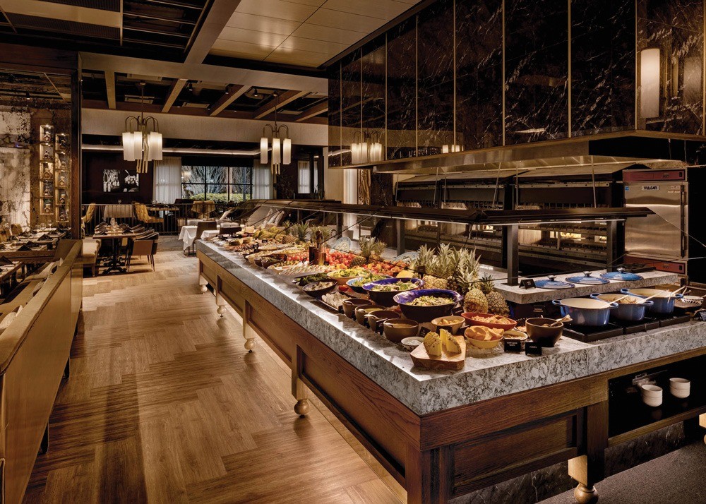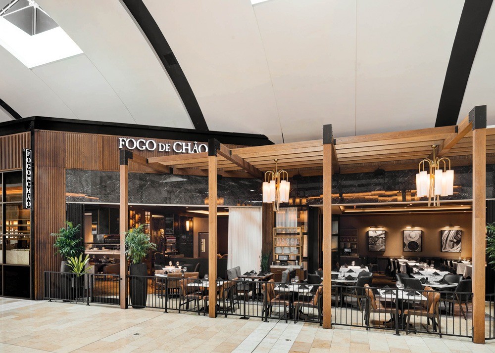 Harrison was tasked with converting a former bar-themed restaurant into a fine-dining experience for Fogo de Chão. It had to represent the chain’s design pillars — warm, timeless and approachable — while also incorporating signatures such as the churrasco grill, market table, bar, dry-aged meat display and two private dining rooms. The design team had to maintain the existing two-story structure and volume and integrate the front and the interior patio with the existing structure of the shopping center building.