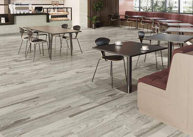 - High-tech Italian porcelain is suitable for high traffic upscale restaurant environments that need durable floor and wall tiles in dramatic artistic designs. This restaurant scene shows the large format architectural porcelain used on the floors and walls in Nero Damascato, a striking marble look, accented in the center wall with Verde Fantastico. Produced in Italy, the Maximum Marmi 120-inch-by-60-inch large format sophisticated slabs are inspired by fine veins, color variations, and elegant details.