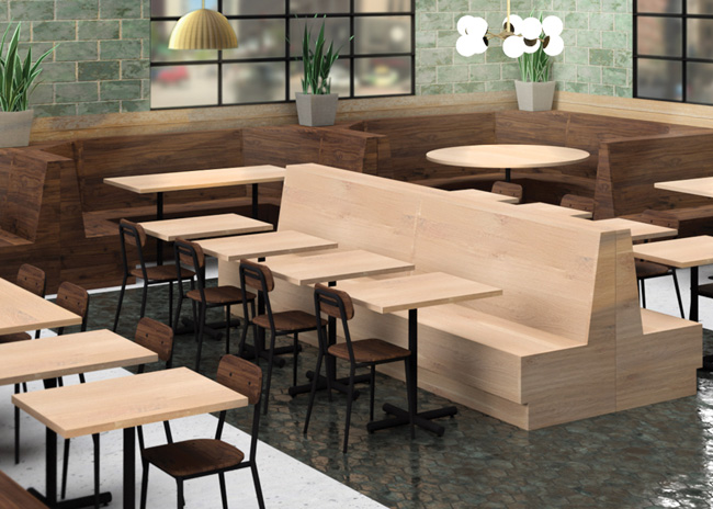 - The Wilmot banquette offers a customizable high-end appearance. It is available in all the company’s wood finishes with or without upholstery. It comes in five lengths and can be placed back-to-back for a double-sided booth. Available in wood, flat panel, vertical channel, or horizontal channel back upholstery.