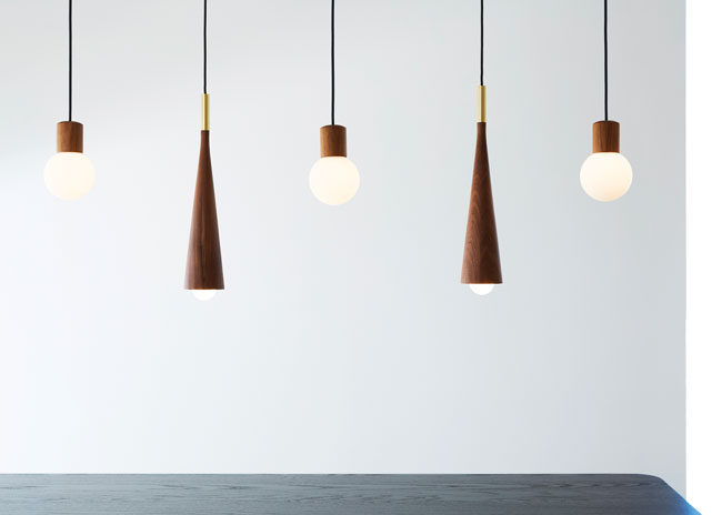 - The conical solid wood spire pairs with handblown frosted glass in both solid white oak and walnut. This pendant, secured with brass, copper or stainless base will serve any environment looking to benefit from the glowing energy hidden within soft, white blooms. Provides 3000K light temperature via a 12V G9 LED bulb.