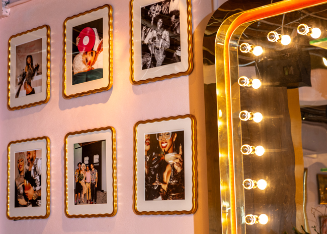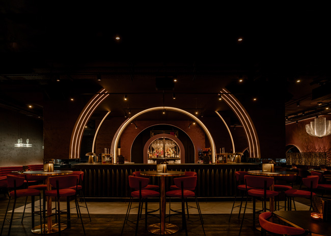 With interiors by Blok Design Group, the 1,000-square-foot elevated champagne bar features velvet banquettes, marble surfaces, lacquered finishes and patterned wall coverings that create tactile richness and depth.