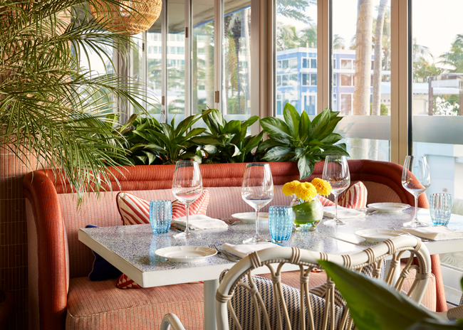Mirabella restaurant in the Fontainebleau Hotel Miami Beach has a strong sense of place but in this case it’s not Miami Beach but coastal southern Italy, especially Positano, the designers hoped to evoke.